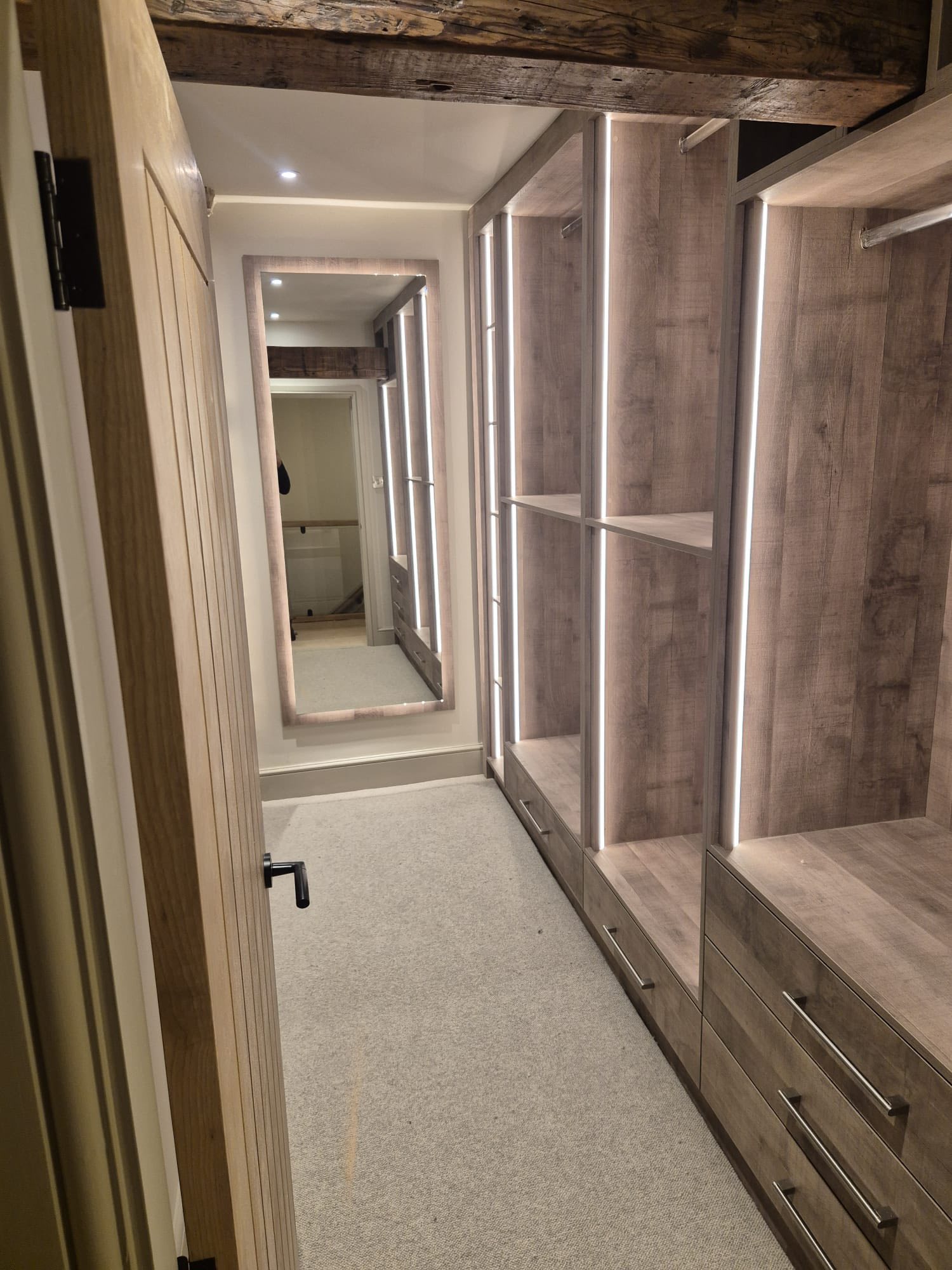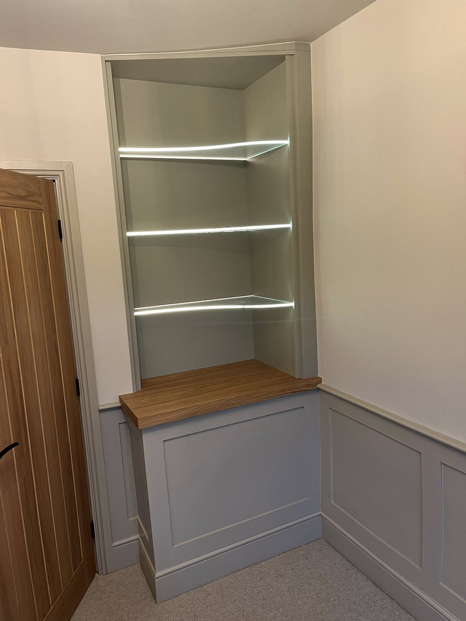 Additional joinery included custom shelving with integrated lighting, oak detailing, skirting boards and architraves, all designed to complement the character of the property. Each element was made to measure and carefully installed to suit the space, resulting in a cohesive and well-finished home throughout.